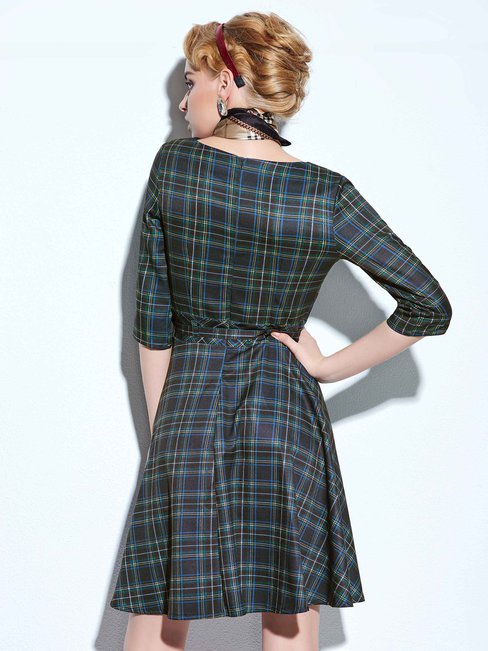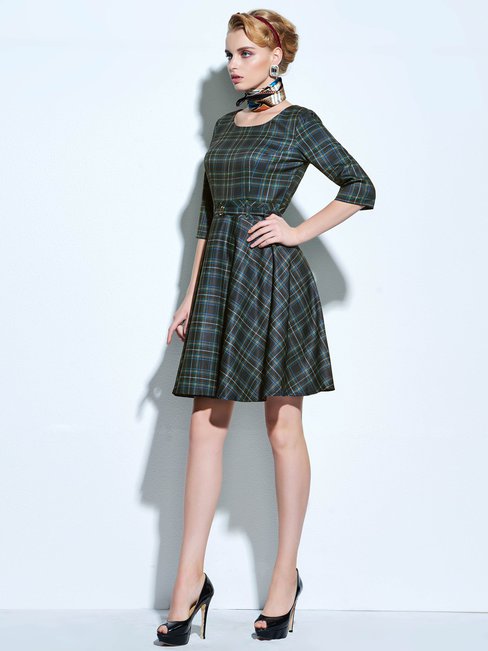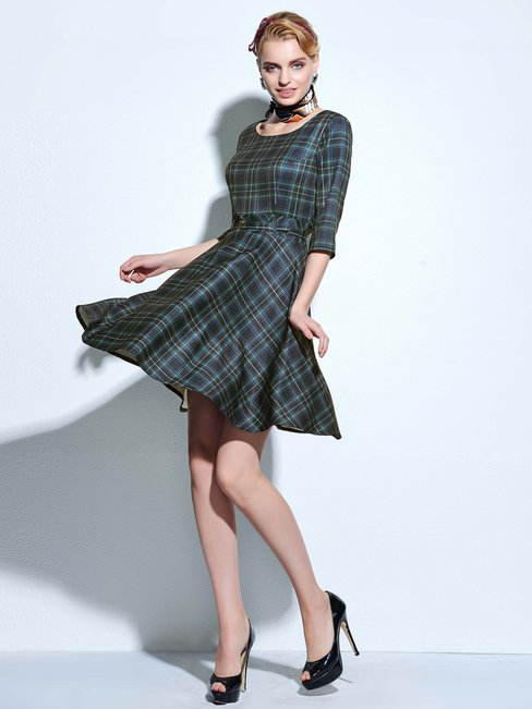 - Dark Blue A-line Round Neck Plaid Strappy Cotton Knee Length Dresses (Style V200028)