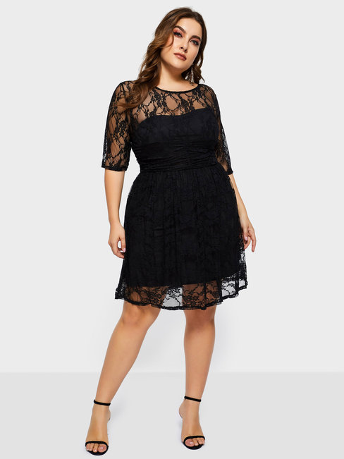 - Black A-line Round Neck Plain Lace Chiffon Knee Length Dresses (Style V201582)