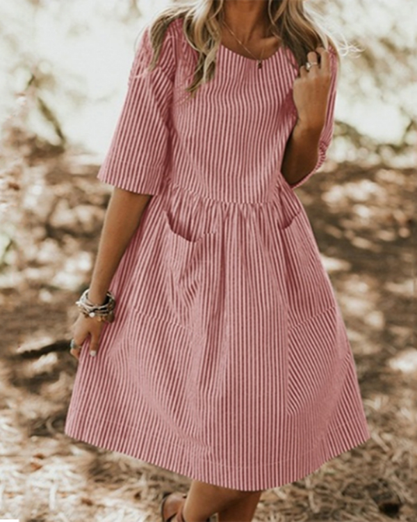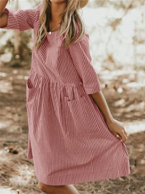 - Pink A-line Round Neck Striped Pattern Polyester Casual Dresses (Style V100531)