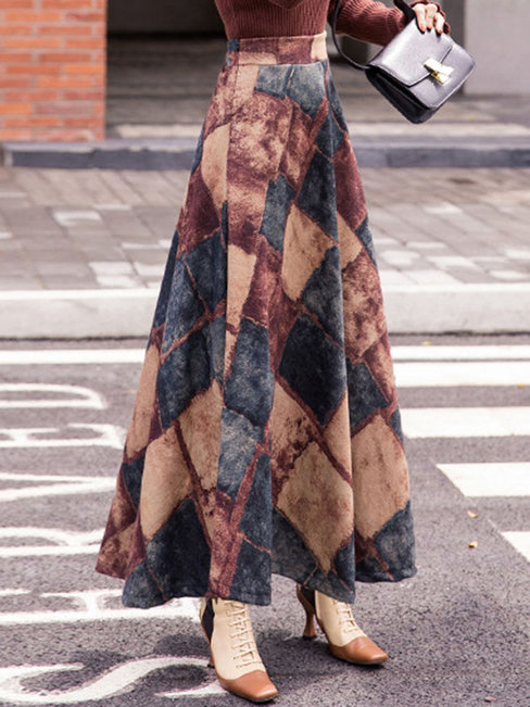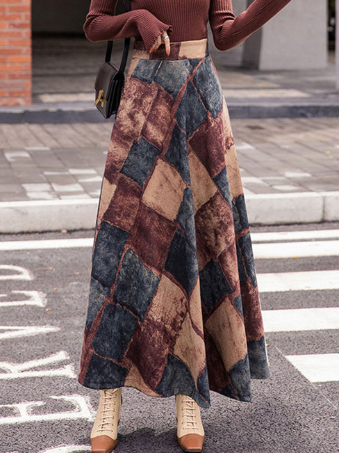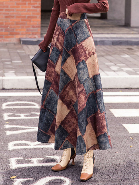 - Blue Ankle Length A-line Slow Life Pattern Color Block Skirt (Style V201900)