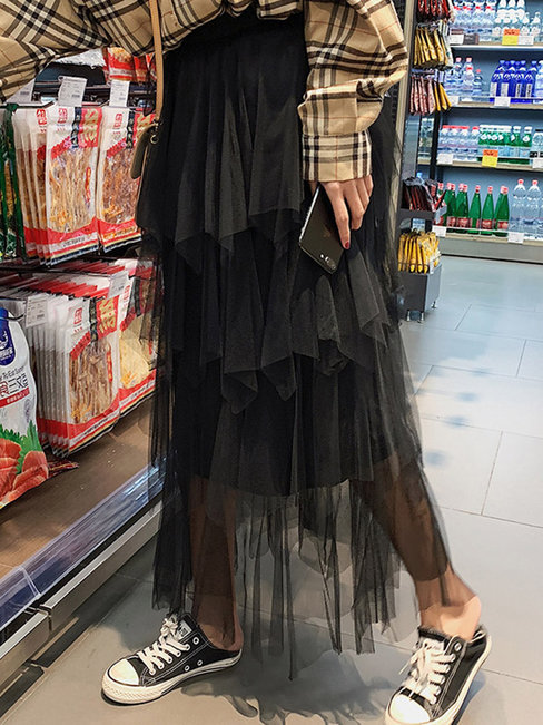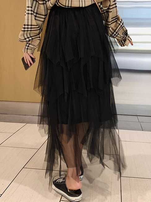 - Black Ankle Length Elegant Ruffle Polyester Plain Skirt (Style V201880)