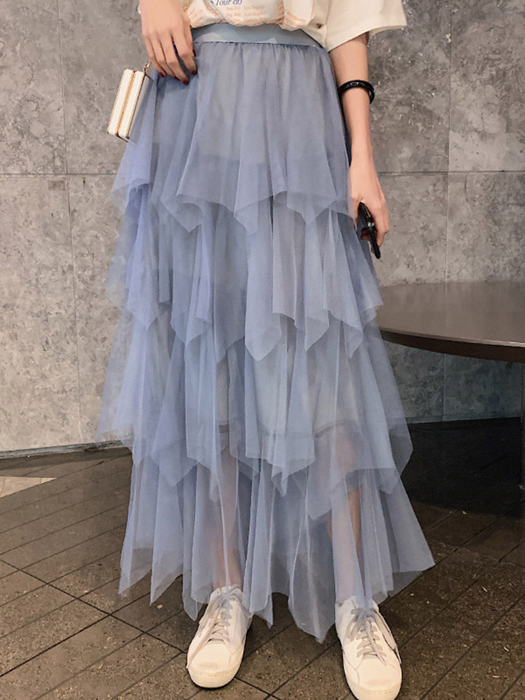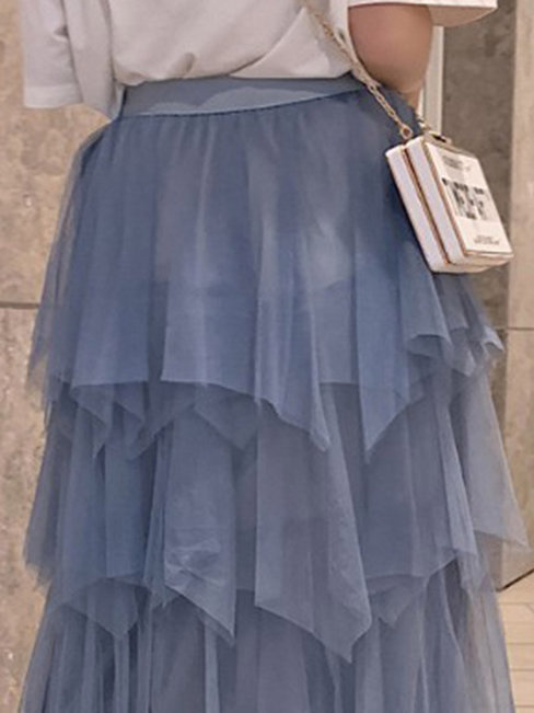 - Blue Ankle Length Elegant Ruffle Polyester Plain Skirt (Style V201880)