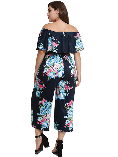 Dark Blue Ankle Length Loose Casual Floral Backless Jumpsuit (Style V200674)