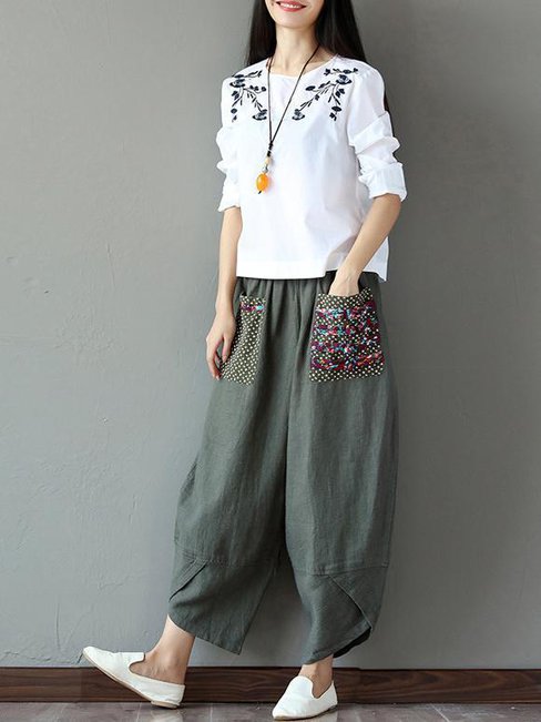 - Blue Ankle Length Loose Slow Life Pattern Cotton Pants (Style V102445)