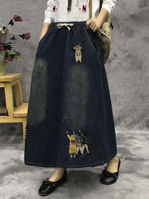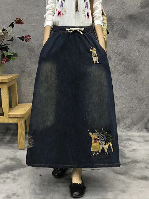 Blue Ankle Length Straight Slow Life Denim Animal Skirt (Style V101750)