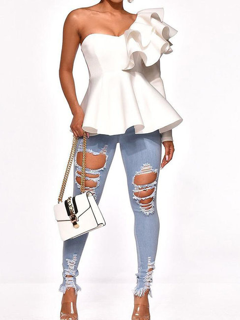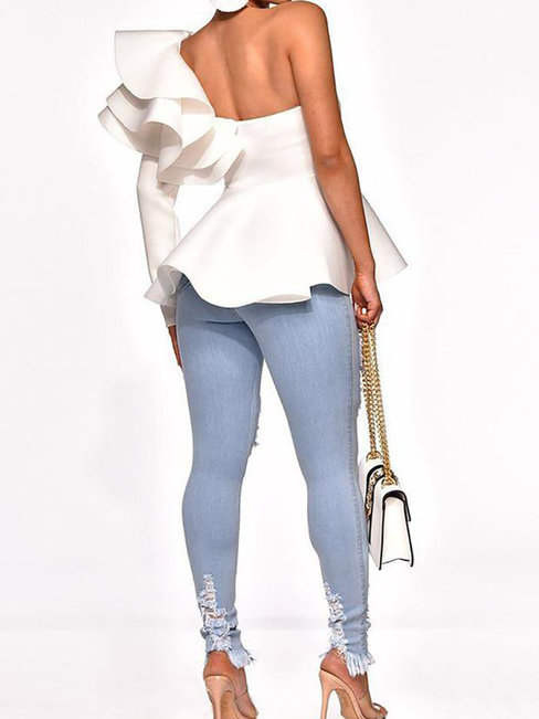- White Asymmetric Slim Date Night Plain Cascading Ruffle T Shirt (Style V300095)
