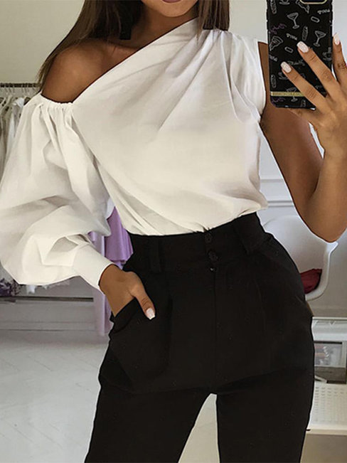 - White Asymmetric Straight Fashion Plain Asymmetrical Blouse (Style V300923)