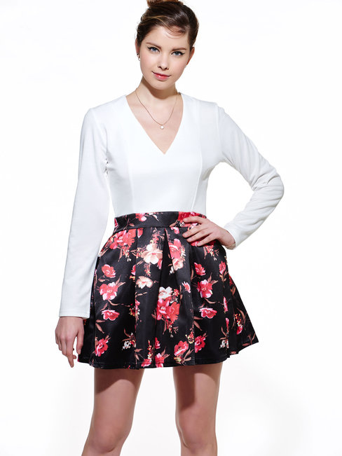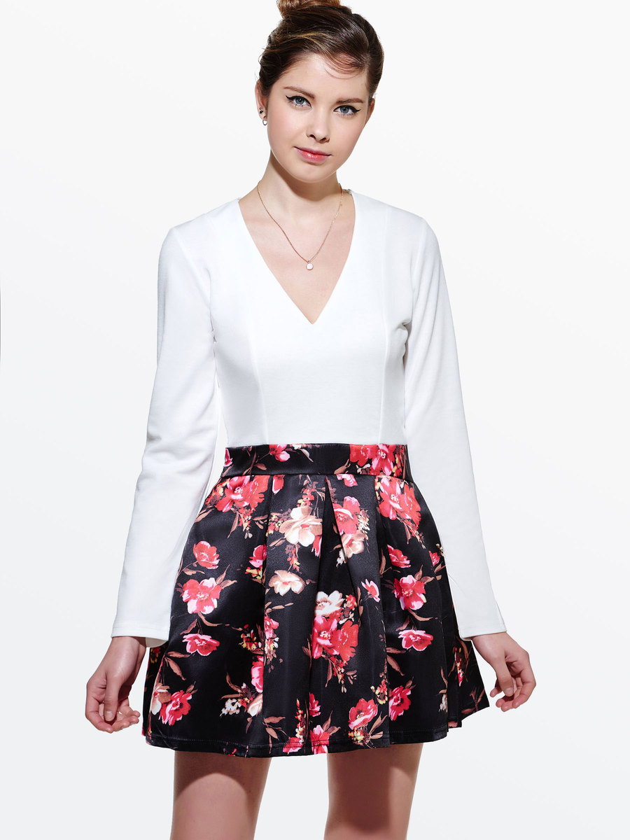 White Ball Gown V-neck Floral Patchwork Cotton Blends Mini Dresses (Style V201575)