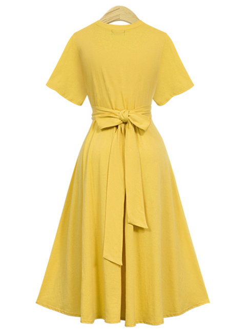 - Black Basic Expansion Round Neck Plain Belt Midi Dresses (Style V200698)