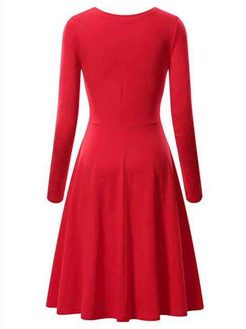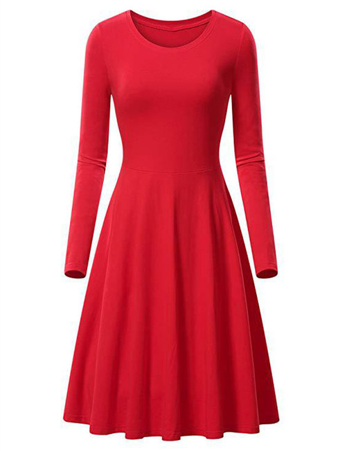 Red Basic Expansion Round Neck Plain Cotton Blends Midi Dresses (Style V200924)