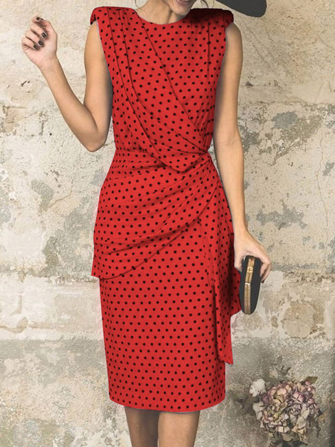 - Red Basic Pencil Round Neck Polka Dot Polyester Casual Dresses (Style V201432)