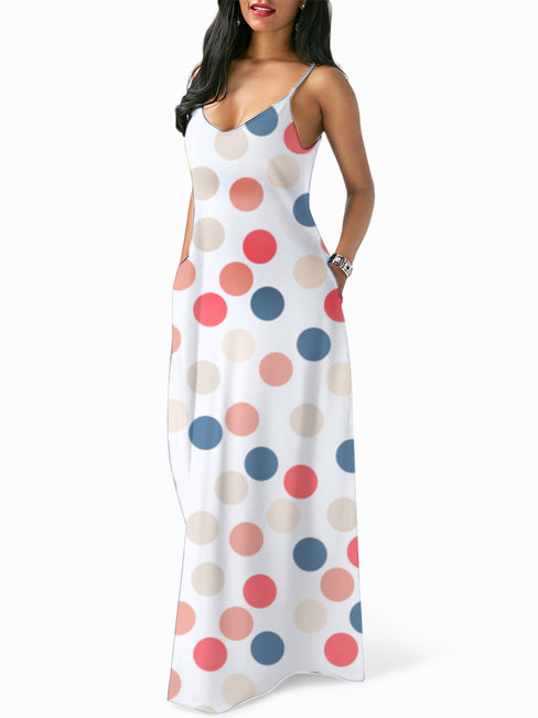 White Beach A-line Spaghetti Strap Polka Dot Print Maxi Dresses (Style V200690)