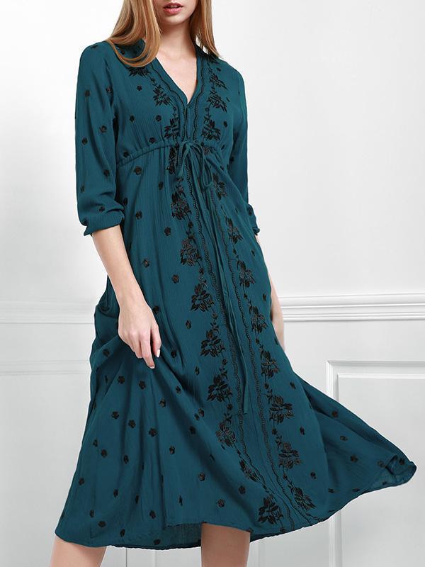 Corsair Beach A-line V-neck Pattern Cotton Boho Dresses (Style V100170)