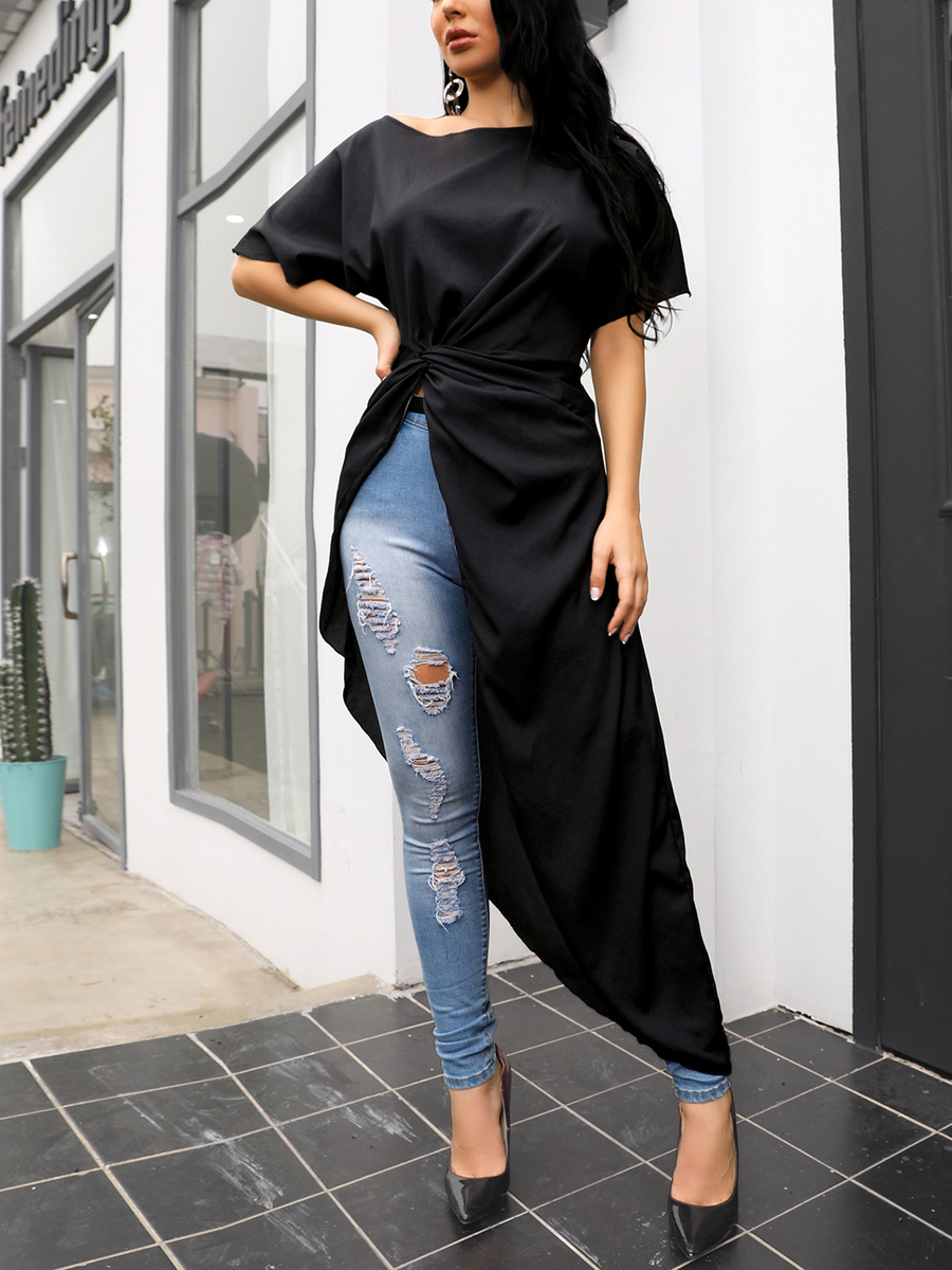 - Black Boat Neck Fashion Plain Cellulose Acetate Fibre Ruffle T Shirt (Style V300123)