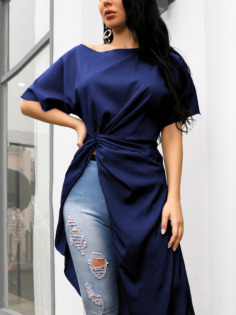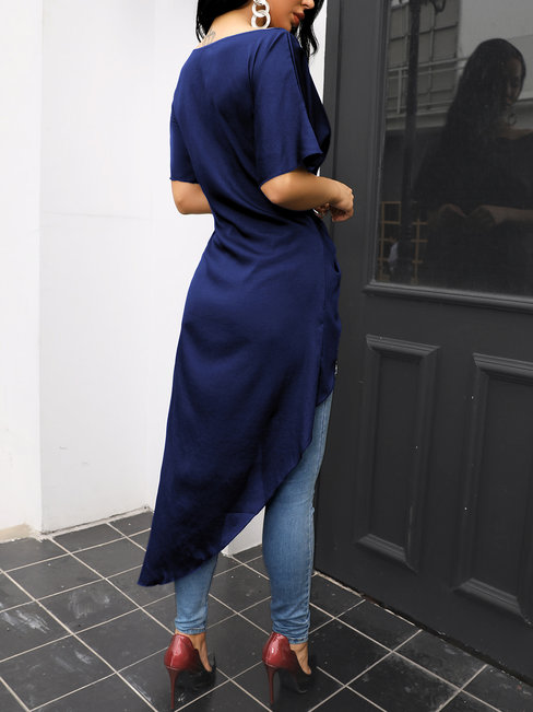 - Dark Blue Boat Neck Fashion Plain Cellulose Acetate Fibre Ruffle T Shirt (Style V300123)