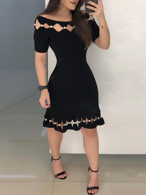 - Black Bodycon Round Neck Solid Color Hollow Out Polyester Bodycon Dresses (Style V300054)