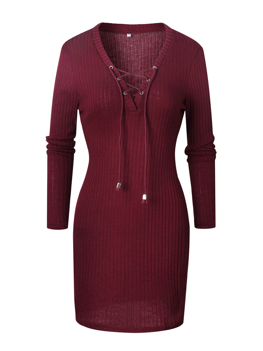 Burgundy Bodycon V-neck Plain Patchwork Polyester Knee Length Dresses (Style V200364)