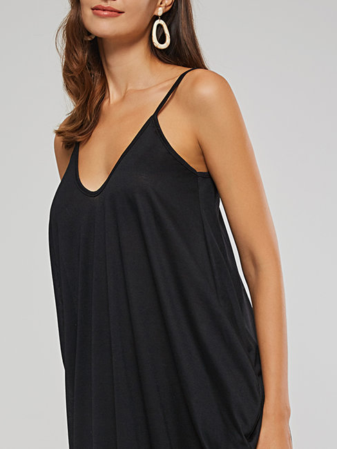 Black Bohemian Spaghetti Strap Plain Backless Cotton Blends Boho Dresses (Style V200898)
