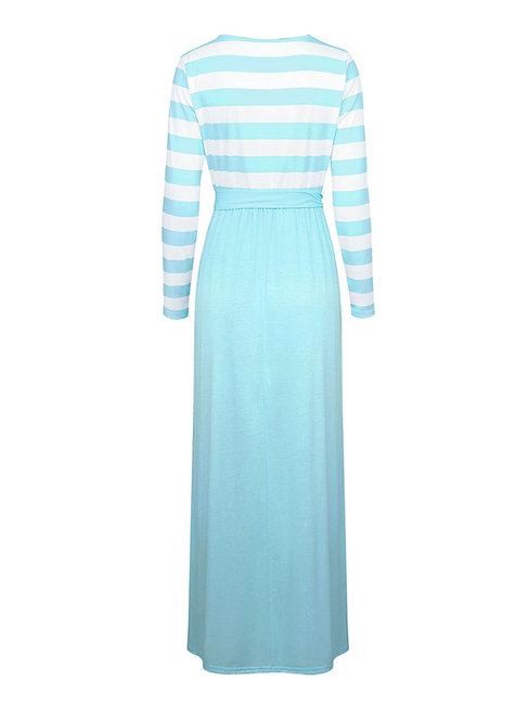 Light Blue Casual A-line V-neck Striped Patchwork Casual Dresses (Style V201108)