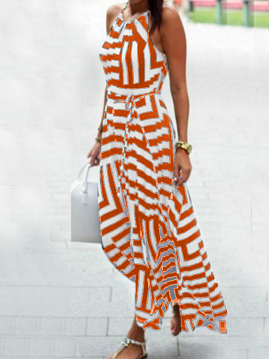 Orange Classy Flowy Spaghetti Strap Patchwork Pattern Maxi Dresses (Style V100428)