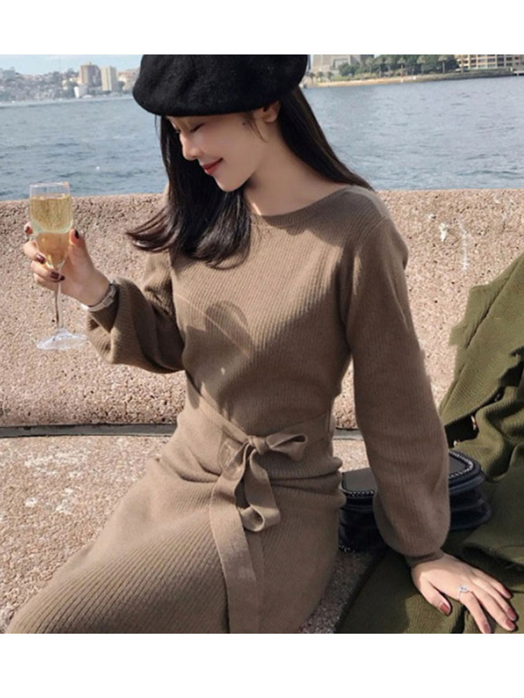 - Khaki Classy Round Neck Solid Color Sash Knitted Midi Dresses (Style V201858)
