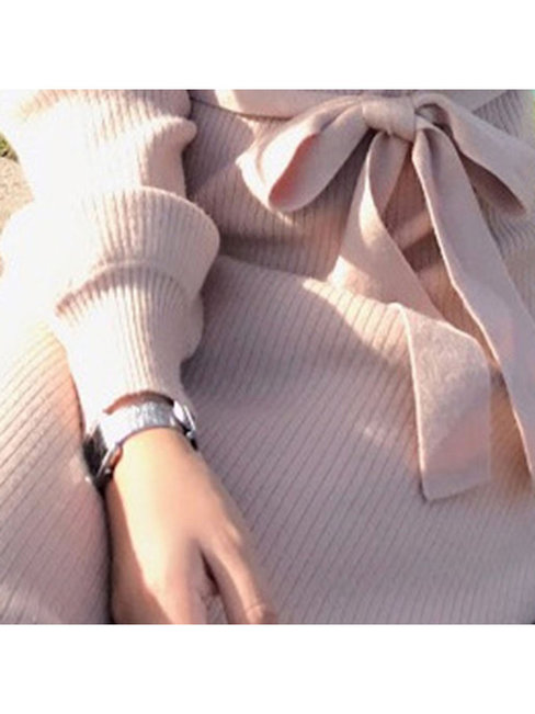 - Light Apricot Classy Round Neck Solid Color Sash Knitted Midi Dresses (Style V201858)