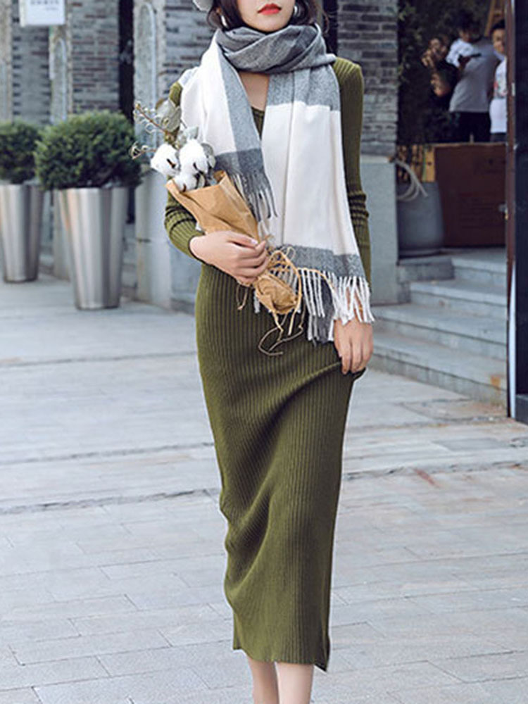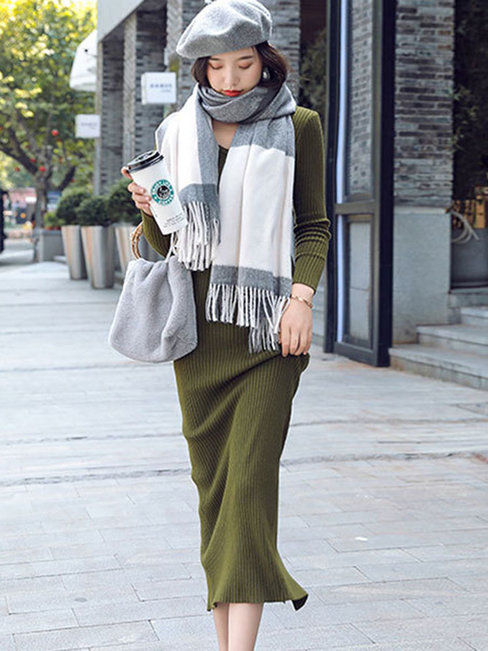 - Army Green Classy Sweater V-neck Solid Color Knitted Midi Dresses (Style V201855)