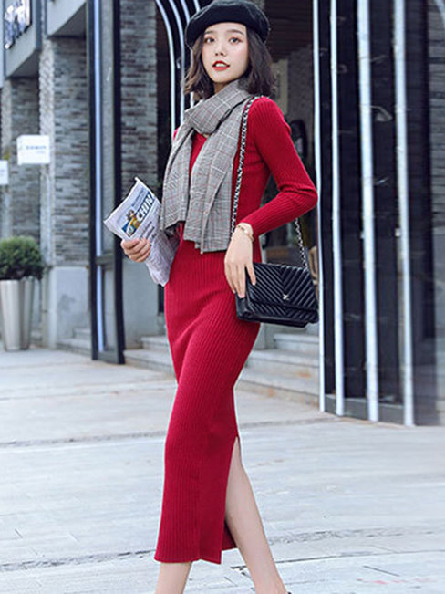 - Red Classy Sweater V-neck Solid Color Knitted Midi Dresses (Style V201855)