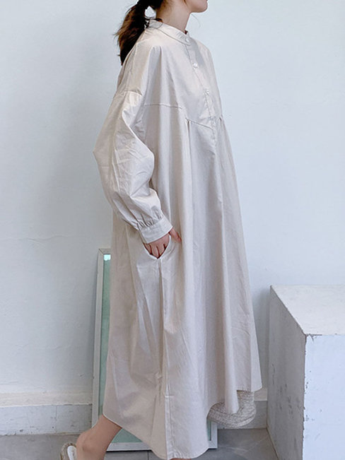 - Light Apricot Cute Shift Round Neck Solid Color Cotton Midi Dresses (Style V201910)