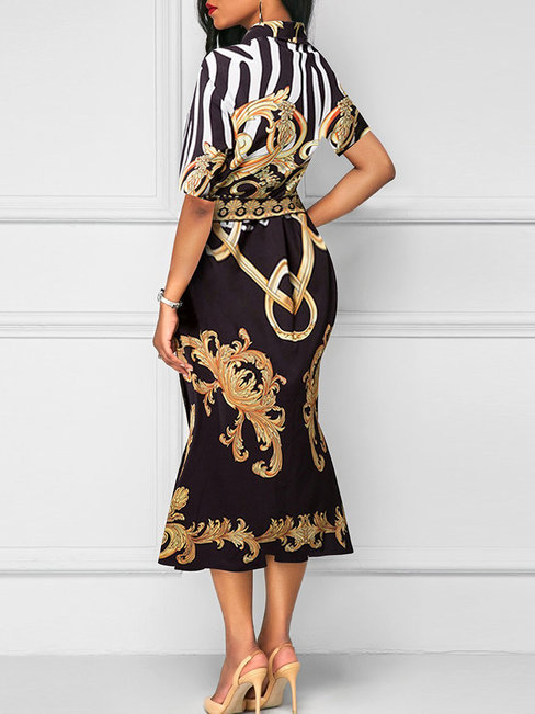 - Yellow Elegant Mermaid Polo Neck Print Polyester Midi Dresses (Style V201248)