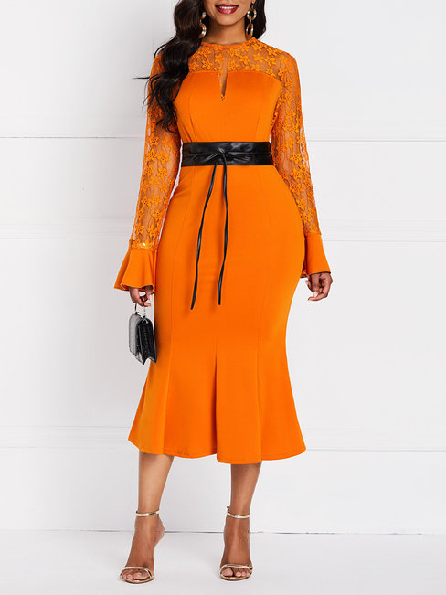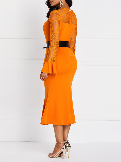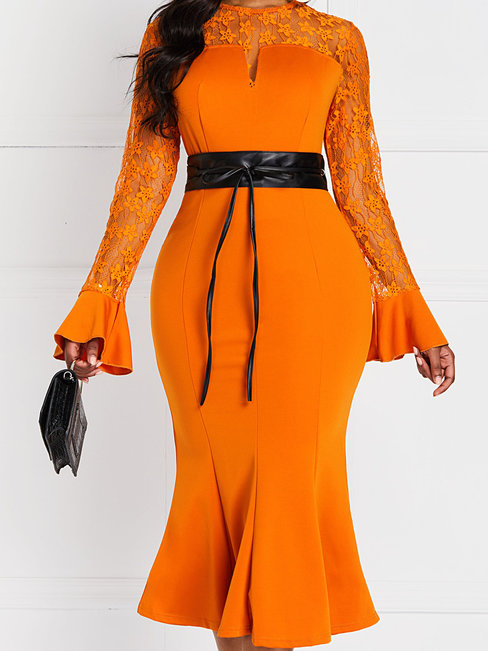 - Orange Elegant Mermaid Round Neck Plain Polyester Work Dresses (Style V201289)