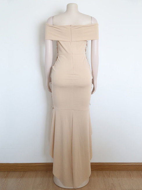 Red Elegant Off The Shoulder Plain Asymmetrical Polyester Maxi Dresses (Style V201235)