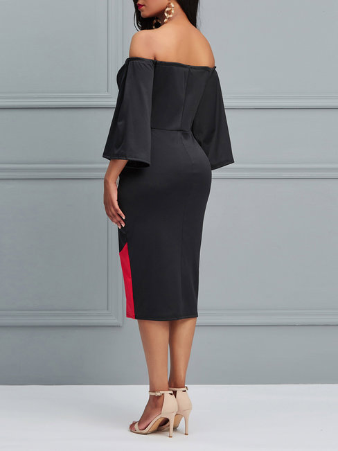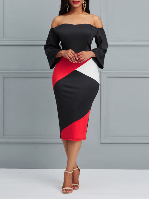 Red England Pencil Off The Shoulder Backless Polyester Midi Dresses (Style V200659)
