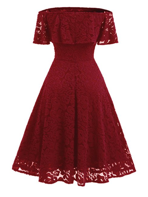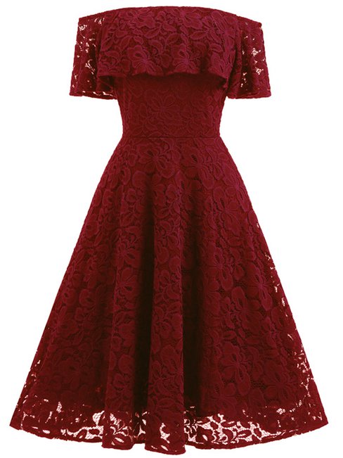- Burgundy Expansion Off The Shoulder Plain Lace Knee Length Dresses (Style V200159)