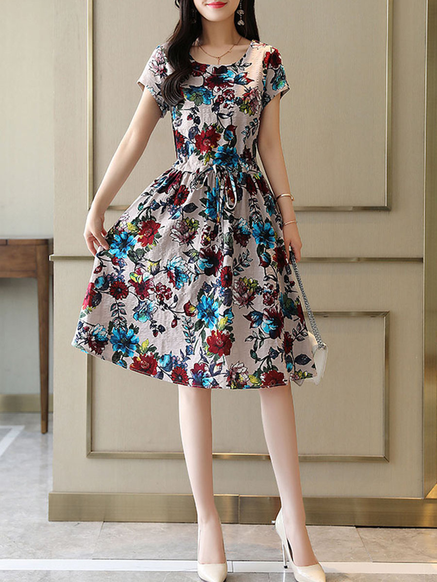 Apricot Going Out A-line Round Neck Printed Polyester Casual Dresses (Style V100485)
