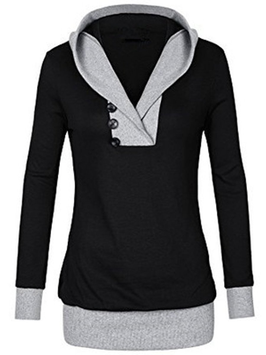 - Black Hooded Casual Patchwork Polyester Button Hoodie (Style V100576)