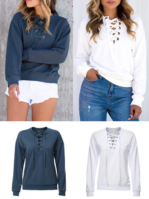 - White Hooded Casual Plain Cotton Strappy Sweatshirts (Style V100753)