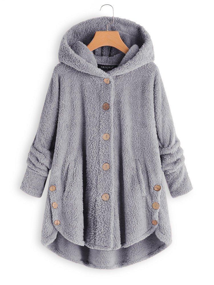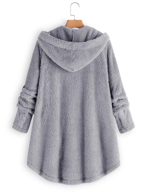 Grey Hooded Loose Plain Dacron Button Coat (Style V101362)
