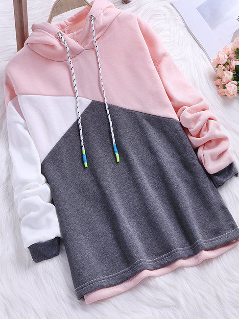 - Pink Hooded Standard Loose Patchwork Polyester Hoodie (Style V100657)