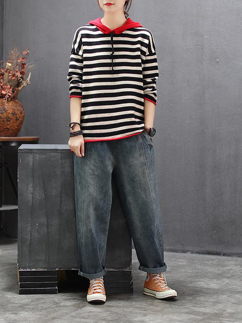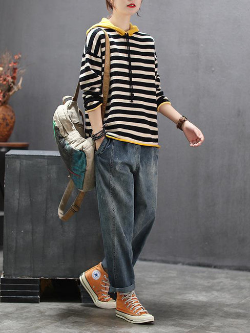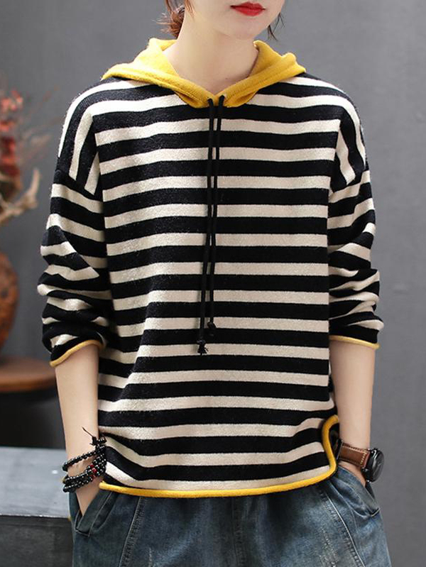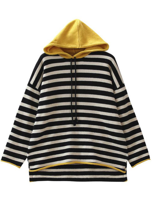 - Yellow Hooded Standard Loose Striped Wool Sweatshirts (Style V100704)