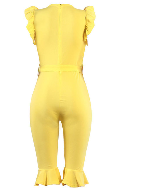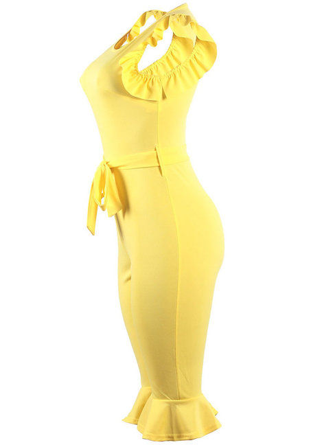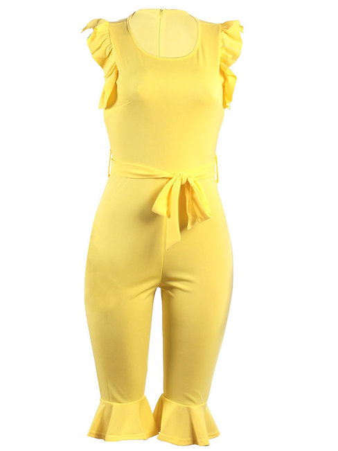 - Yellow Knee Length Slim Casual Plain Cotton Jumpsuit (Style V201499)