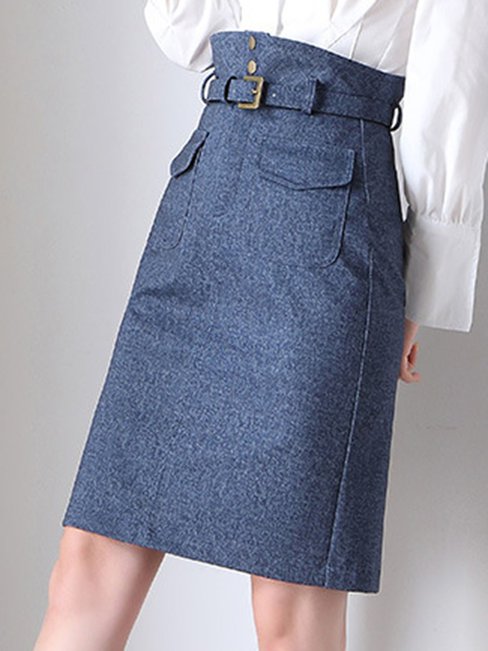 - Blue Knee Length Straight Office Polyester Plain Skirt (Style V101850)