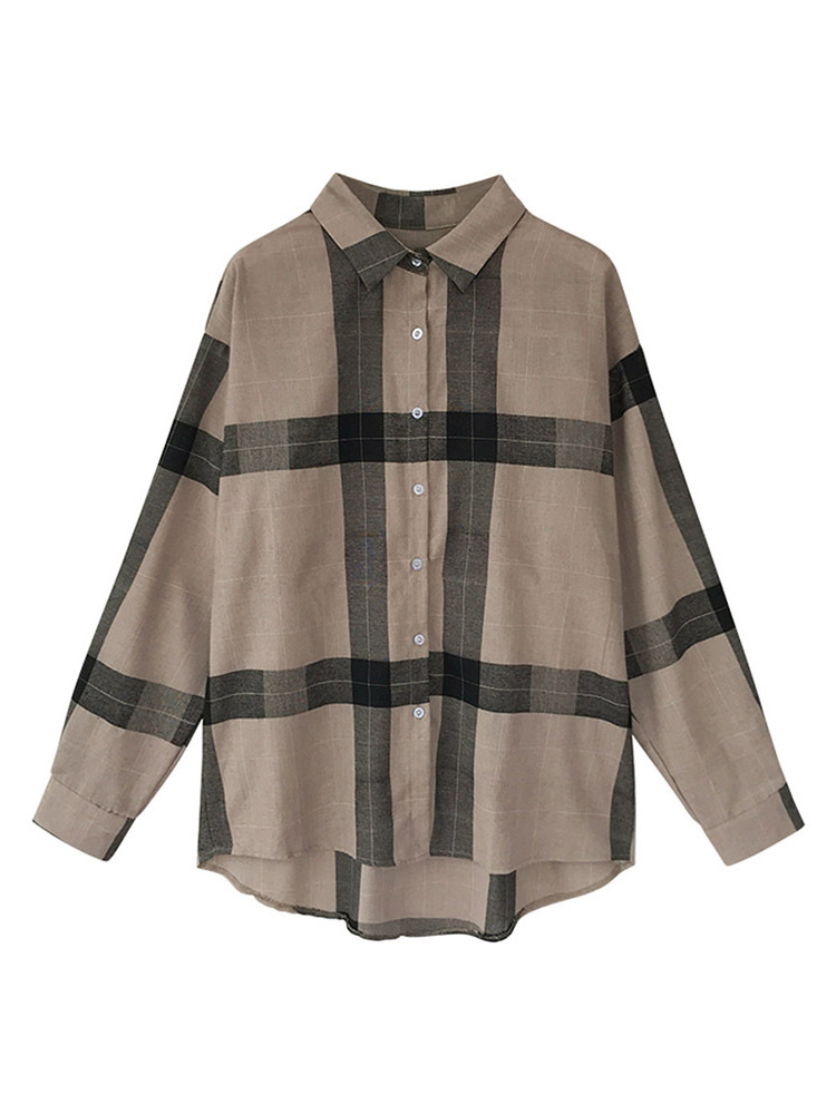 - Khaki Long Loose Elegant Hemp Thread Button Blouse (Style V201720)