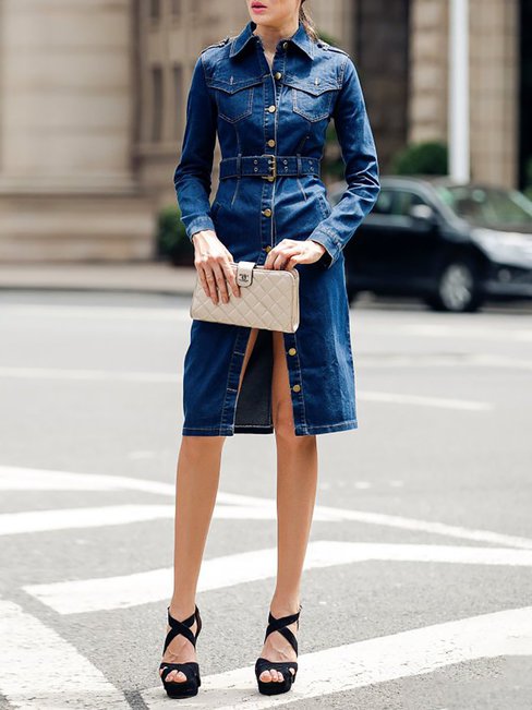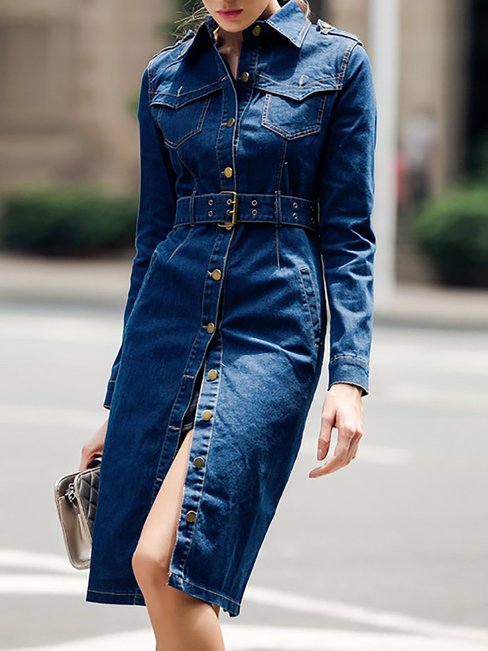 Dark Blue Long Slim Casual Plain Button Coat (Style V101326)