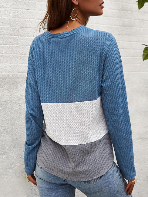 - Blue Loose Date Night Color Block Polyester Button Blouse (Style V300063)