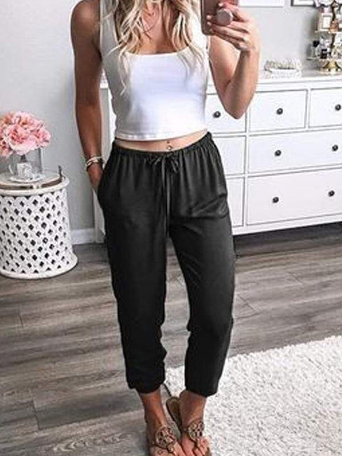 Black Loose Slow Life Pockets Polyester Plain Pants (Style V102399)