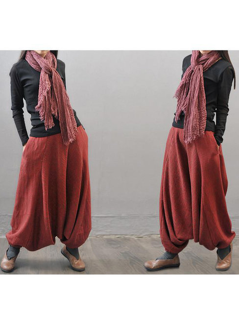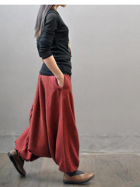 Red Maxi Fashion Pockets Linen Plain Pants (Style V102373)