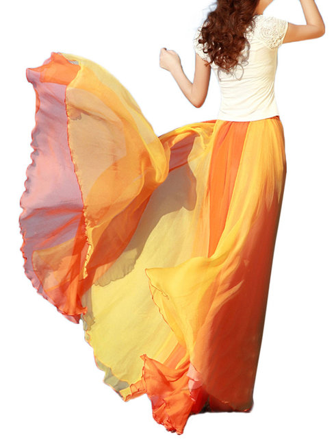 Orange Maxi Loose Slow Life Cascading Ruffle Color Block Skirt (Style V101758)