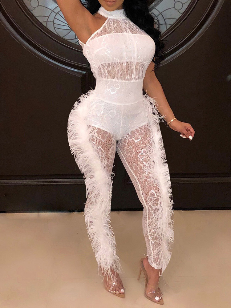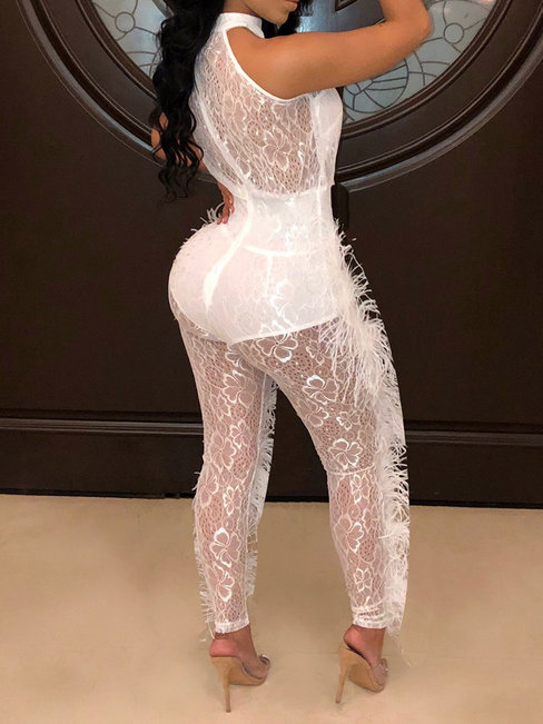 White Maxi Skinny Party Plain Hollow Out Jumpsuit (Style V201340)