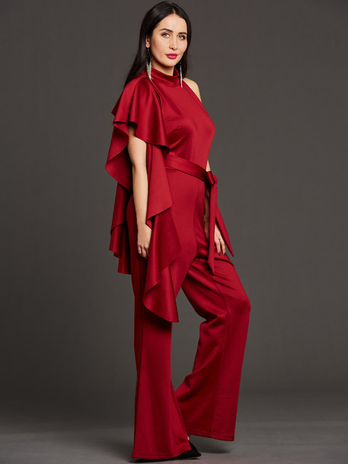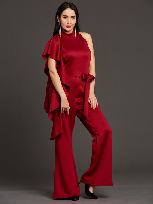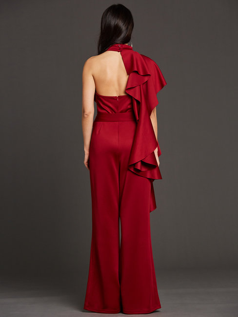 - Burgundy Maxi Slim Plain Polyester Asymmetrical Jumpsuit (Style V200277)